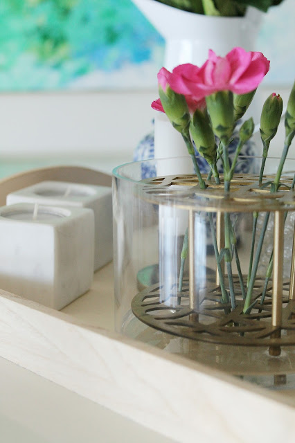 I am obsessed with trays. I have all sizes and shapes. I think they are a fun little way to show of some of your favorite decor items! In the pictures below I mixed a succulent, blush carnations (in my favorite vase that I got from V on my birthday last year), a blue jar and some gold details. My absolute favorite color combination! Simple, easy and beautiful!